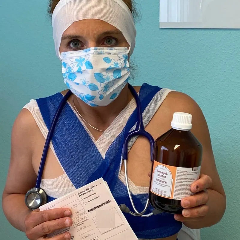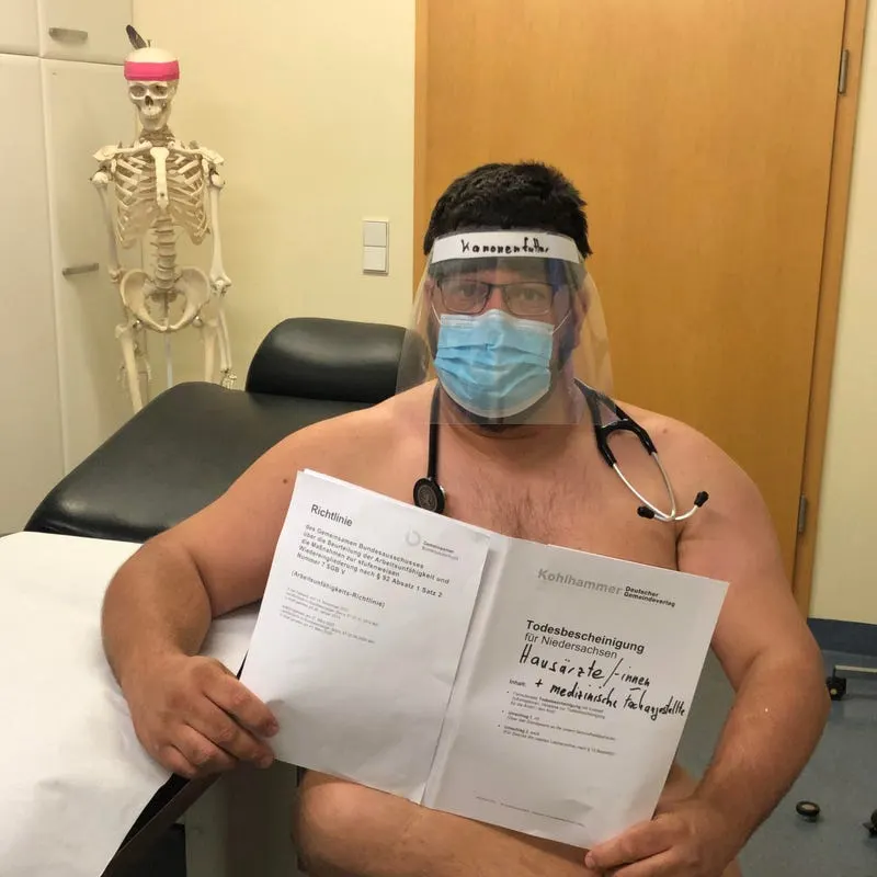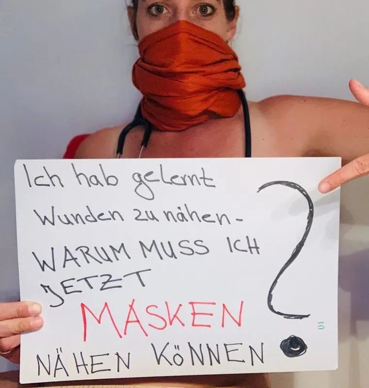 ทีมแพทย์และพยาบาลในประเทศเยอรมัน ที่มีชื่อว่า BlankeBedenken กลุ่มดังกล่าวได้ออกมาเคลื่อนไหว โดยการถ่ายภาพเปลือยเป็นการ 'การะทำในเชิงสัญลักษณ์ให้รู้ว่าพวกเขามีความเสี่ยงแค่ไหนถ้าเราไม่มีชุดป้องกันใดๆ เลย' ในการสู้รบกับโรคโควิด 19