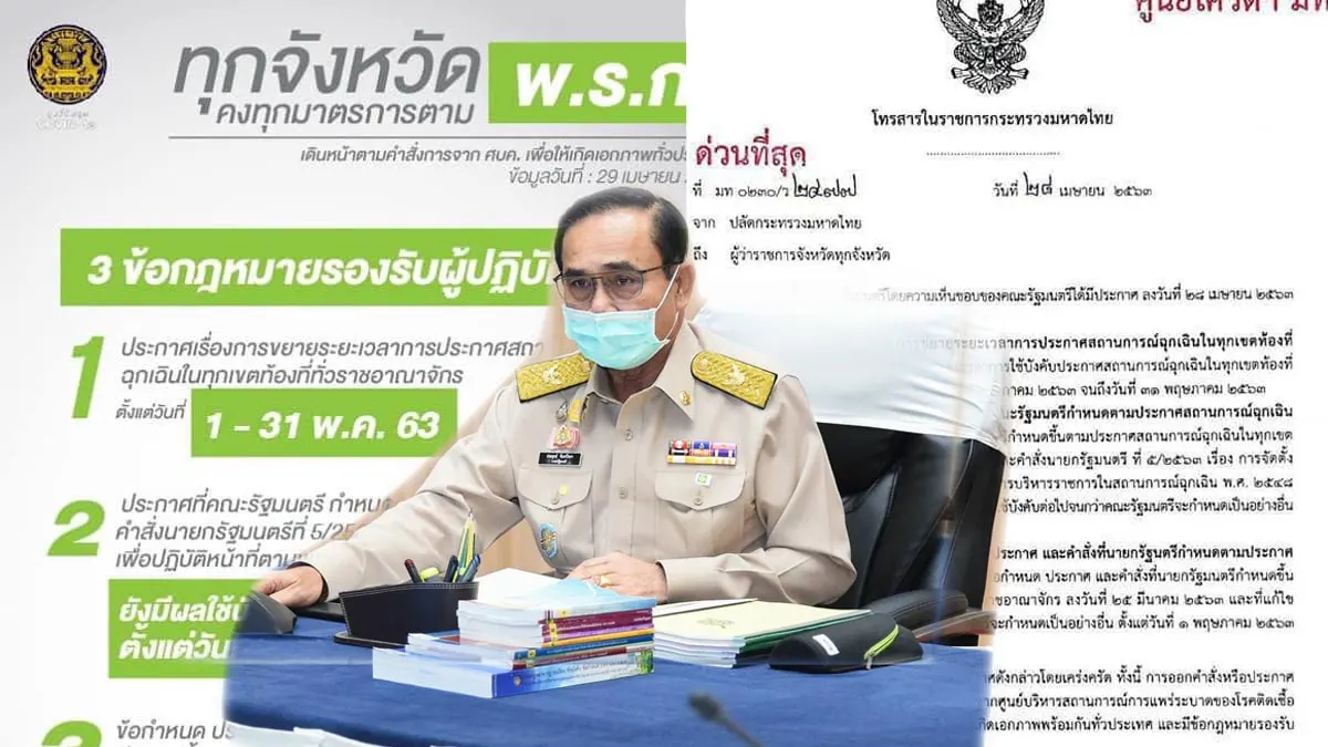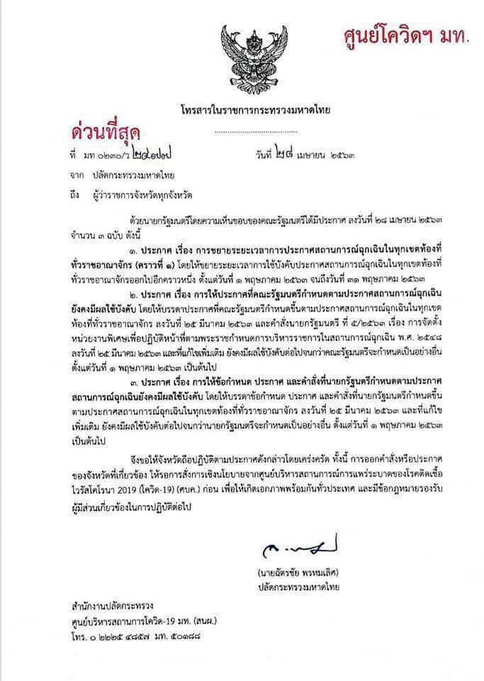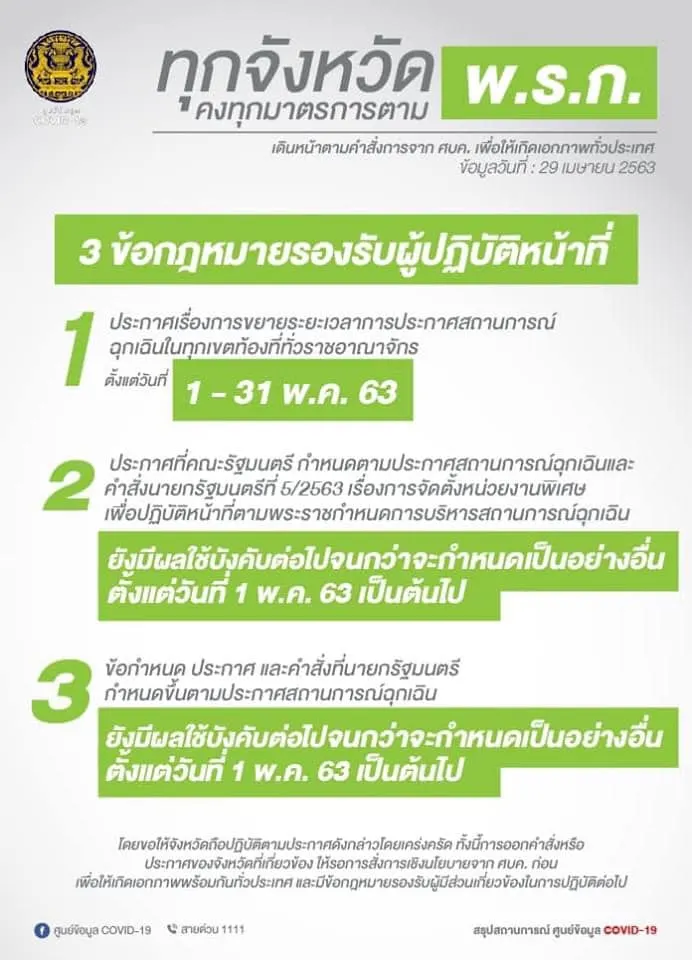 1️⃣ ประกาศเรื่องการขยายระยะเวลาการประกาศสถานการณ์ฉุกเฉินในทุกเขตท้องที่ทั่วราชอาณาจักร ตั้งแต่วันที่ 1 พ.ค. จนถึงวันที่ 31 พ.ค.2563