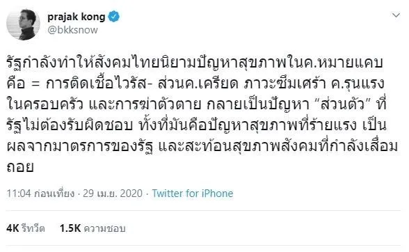 รัฐกำลังทำให้สังคมไทยนิยามปัญหาสุขภาพในความหมายแคบ คือ การติดเชื้อไวรัส ส่วนความเครียด ภาวะซึมเศร้า ความรุนแรงในครอบครัว และการฆ่าตัวตาย กลายเป็นปัญหา “ส่วนตัว” ที่รัฐไม่ต้องรับผิดชอบ