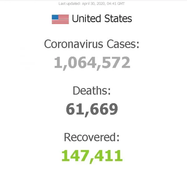ล่าสุด ขณะที่สถานการณ์การแพร่ระบาดของไวรัสโควิด-19 ของสหรัฐอเมริกา มียอดผู้ติดเชื้อสะสม อยู่ที่1,064,572 ราย ผู้ติดเชื้อเพิ่ม +28,429 ราย และยอดเสียชีวิตสะสม 61,656ราย โดยมีเสียชีวิตเพิ่ม +2,390 ราย ทั้งนี้มี5อันดับรัฐที่มีผู้ติดเชื้อมากที่สุด คือ รัฐนิวยอร์ก , นิว เจอร์ซี , แมสซาชูเซตส์ , อิลลินอยส์ และแคลิฟอร์เนีย ตามลำดับ