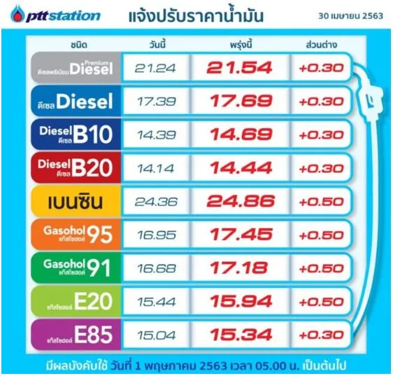 มีรายงานว่า วันนี้(30 เม.ย.) บมจ.ปตท.(PTT) ได้ปรับขึ้นราคาน้ำมัน โดยน้ำมันกลุ่มดีเซลทุกชนิด ไม่ว่าจะเป็น พีทีที อัลตร้าฟอร์ซ ดีเซล , พีทีที อัลตร้าฟอร์ซ ดีเซลพรีเมียม , พีทีที อัลตร้าฟอร์ซ ดีเซล B10 และ พีทีที อัลตร้าฟอร์ซ ดีเซล B20 ปรับขึ้น 30 สตางค์/ลิตร ส่วนน้ำมันกลุ่มเบนซินและแก๊สโซฮอล์ทุกชนิด ปรับขึ้น 50 สตางค์/ลิตร เว้น E85 ปรับขึ้น 30 สตางค์/ลิตร มีผลวันพรุ่งนี้ (1 พ.ค.) ตั้งแต่เวลาตี 5 เป็นต้นไป