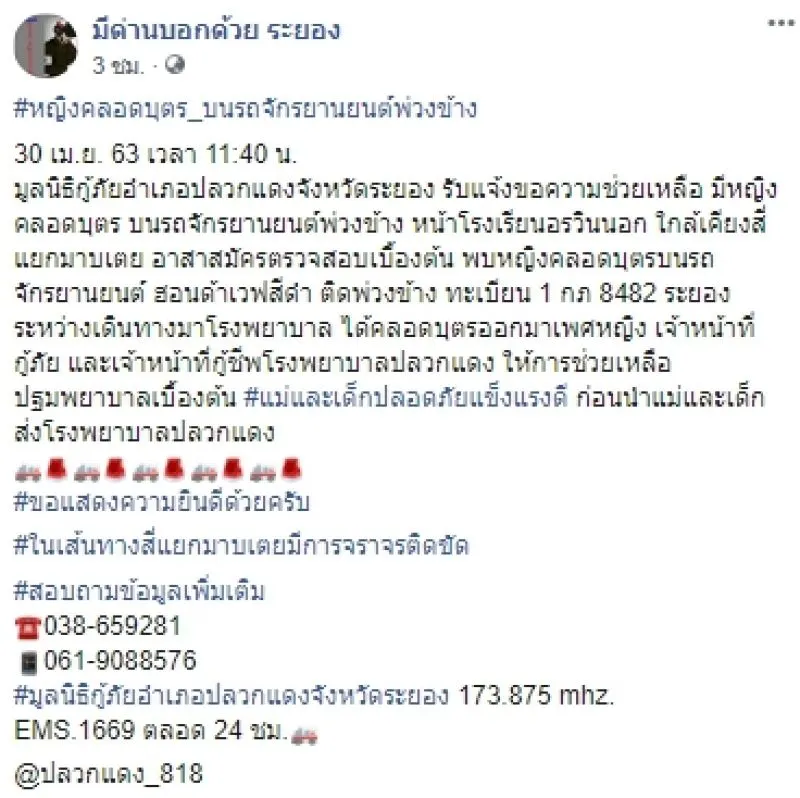 เมื่อวันที่ 30 เมษายน 2563 ที่ผ่านมา ที่เพจ มีด่านบอกด้วย ระยอง ได้โพสต์รูปภาพพร้อมทั้งระบุข้อความว่า มูลนิธิกู้ภัยอำเภอปลวกแดงจังหวัดระยอง รับแจ้งขอความช่วยเหลือ มีหญิงคลอดบุตร บนรถจักรยานยนต์พ่วงข้าง