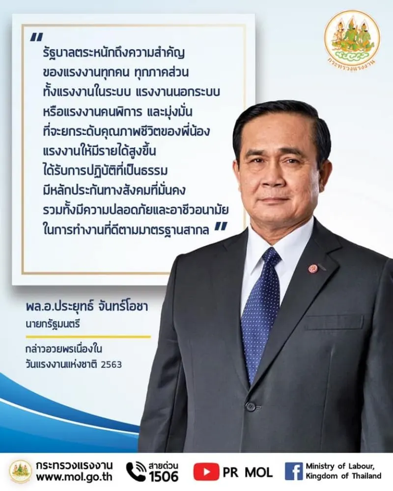 วันที่ 1 พฤษภาคม 63 มีรายงานว่า พล.อ.ประยุทธ์ จันทร์โอชา นายกรัฐมนตรี และรัฐมนตรีว่าการกระทรวงกลาโหม ได้กล่าวอวยพรเนื่องในวันแรงงานแห่งชาติ ปี 2563 รัฐบาลตระหนักถึงความสำคัญของแรงงานทุกคน ทุกภาคส่วน และมุ่งมั่นที่จะยกระดับคุณภาพชีวิตของพี่น้องแรงงาน ซึ่งที่ผ่านมารัฐบาลได้ดำเนินการแล้วหลายเรื่อง