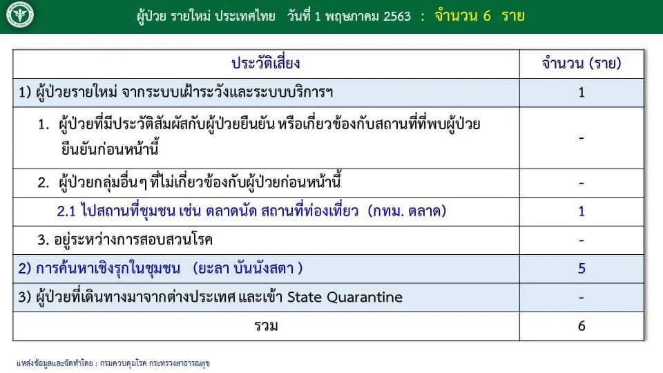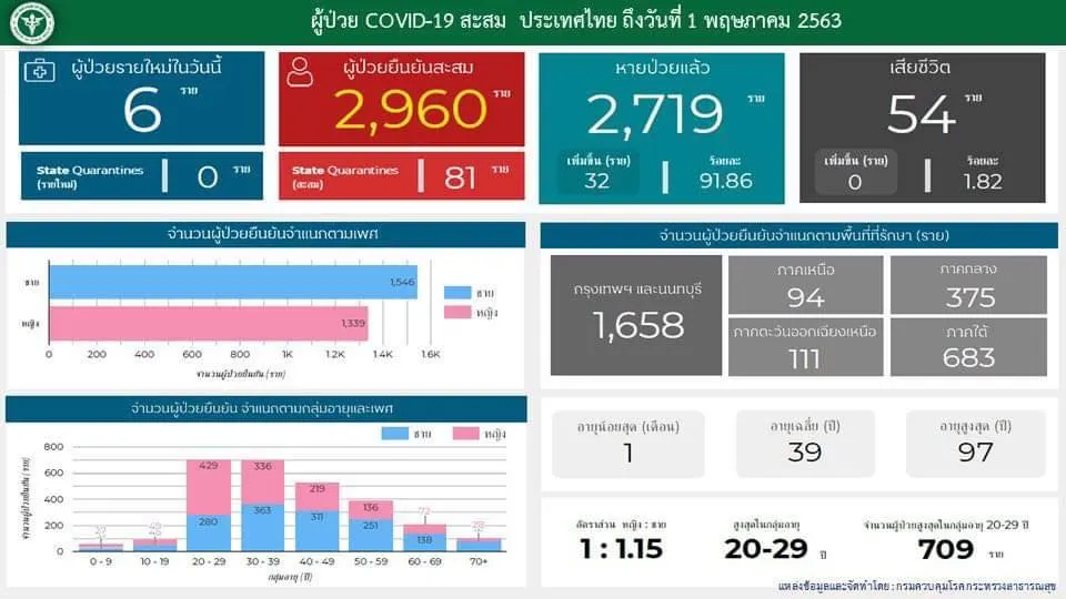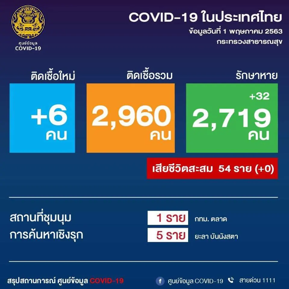 ไทยพบผู้ติดเชื้อโควิดเพิ่ม 6 ราย รวมผู้ติดเชื้อสะสม 2,960 ราย เสียชีวิต 54 ราย