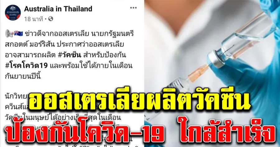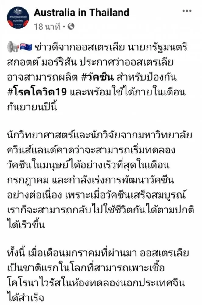 วันที่ 1 พฤษภาคม 2563 เพจเฟซบุ๊กที่ใช้ชื่อว่า Australia in Thailand ระบุว่า ข่าวดีจากออสเตรเลีย นายกรัฐมนตรีสกอตต์ มอร์ริสัน ประกาศว่า ออสเตรเลียอาจสามารถผลิตวัคซีน สำหรับป้องกัน #โรคโควิด19 และพร้อมใช้ได้ภายในเดือนกันยายนปีนี้