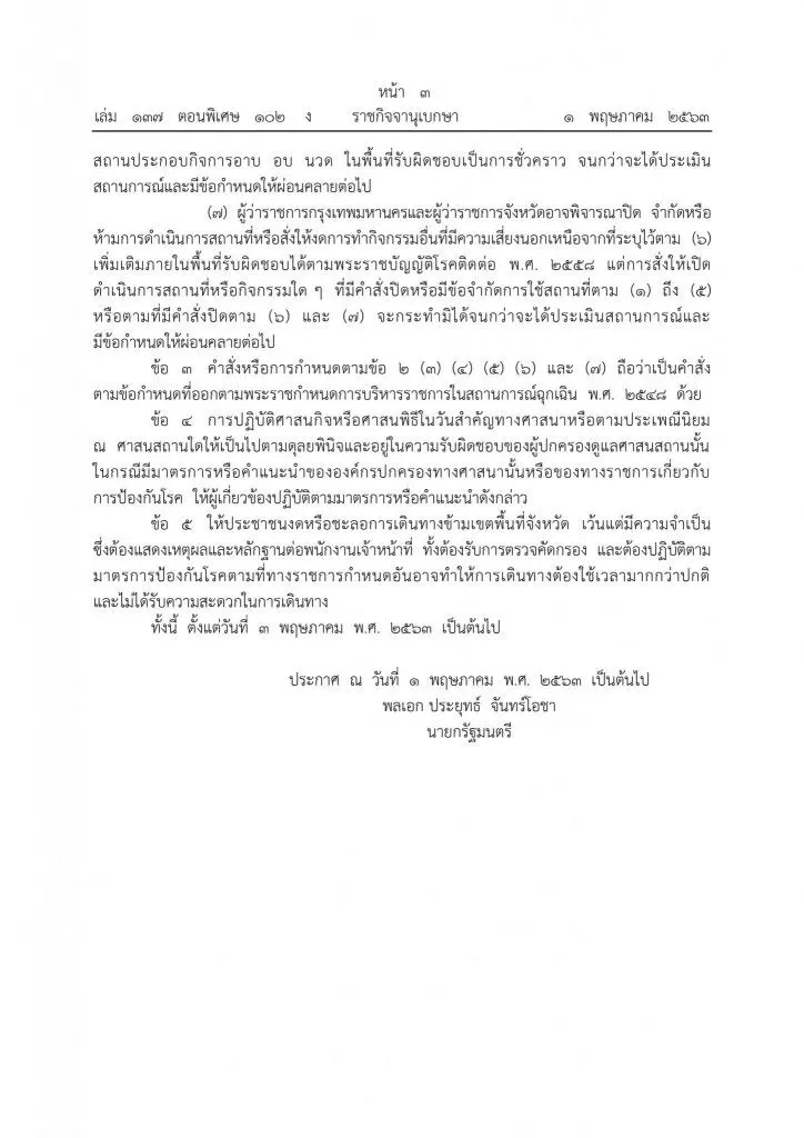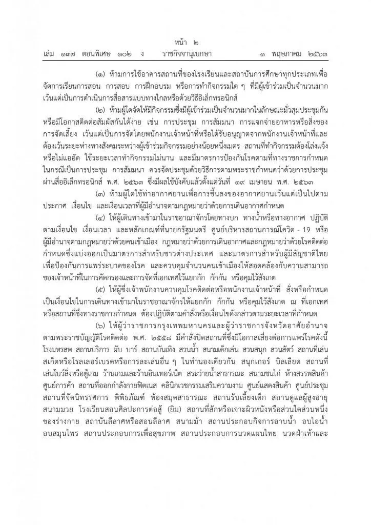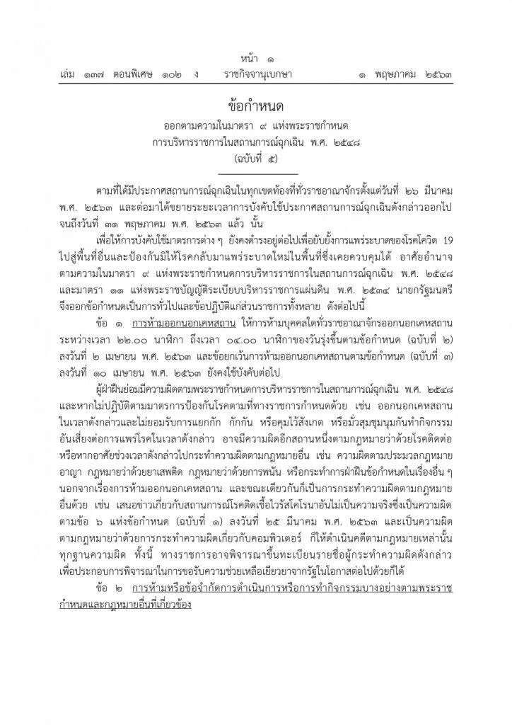 หลังจากที่คณะรัฐมนตรี (ครม.) มีมติไม่เลื่อนวันหยุดในเดือนพฤษฎาคม 2563 ล่าสุดเมื่อวันที่ 1 พฤษภาคม 2563 เวบไซท์ราชกิจจานุเบกษาเผยแพร่ข้อกำหนดออกตามความในมาตรา 9 แห่งพระราชกำหนดการบริหารสถานการณ์ในสถานการณ์ฉุกเฉิน พศ. 2548 ฉบับที่ 5 โดยมีข้อห้ามดังนี้