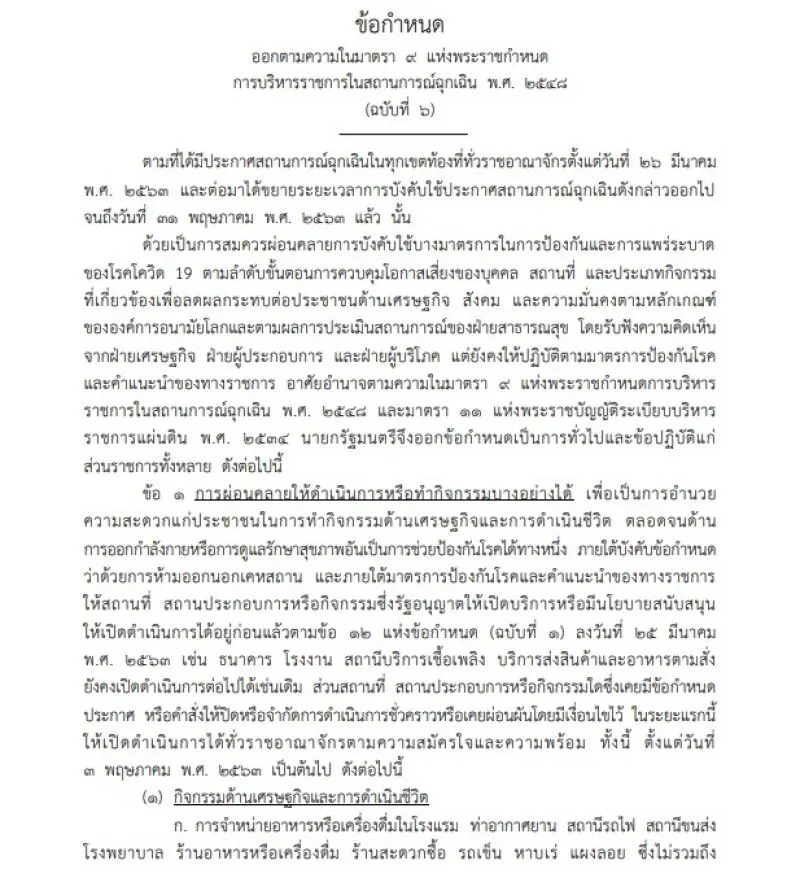 เมื่อวันที่ 1 พ.ค. เว็บไซต์ราชกิจจานุเบกษา เผยแพร่ข้อกำหนด ออกตามความในมาตรา 9 แห่งพ.ร.ก.ฉุกเฉิน พ.ศ.2548 (ฉบับที่ 6)