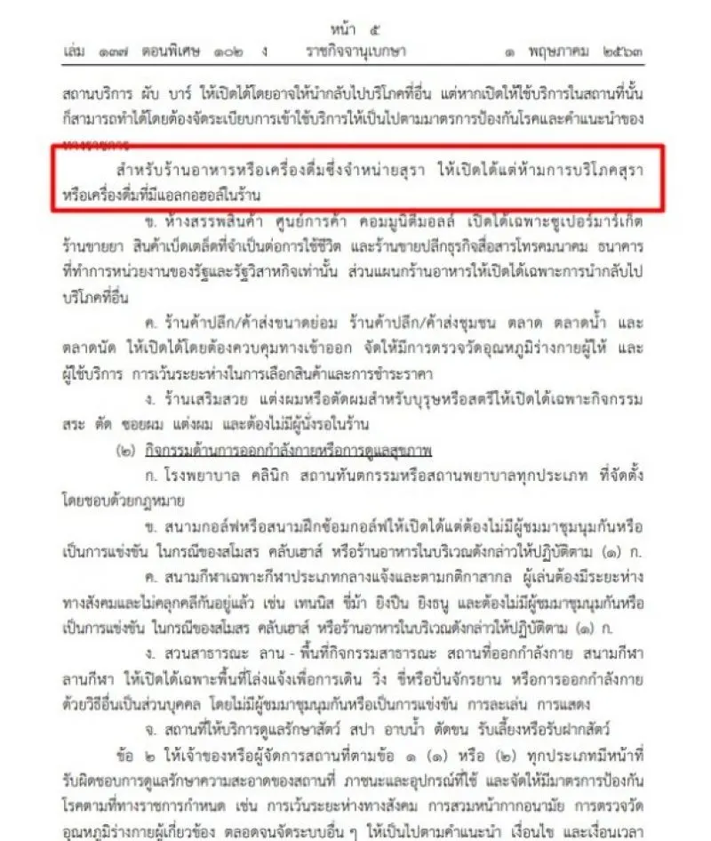 สำหรับร้านอาหารหรือเครื่องดื่ม ซึ่งจำหน่ายสุรา ให้เปิดได้แต่ห้ามการบริโภคสุรา หรือเครื่องดื่มที่มีแอลกอฮอล์ในร้าน