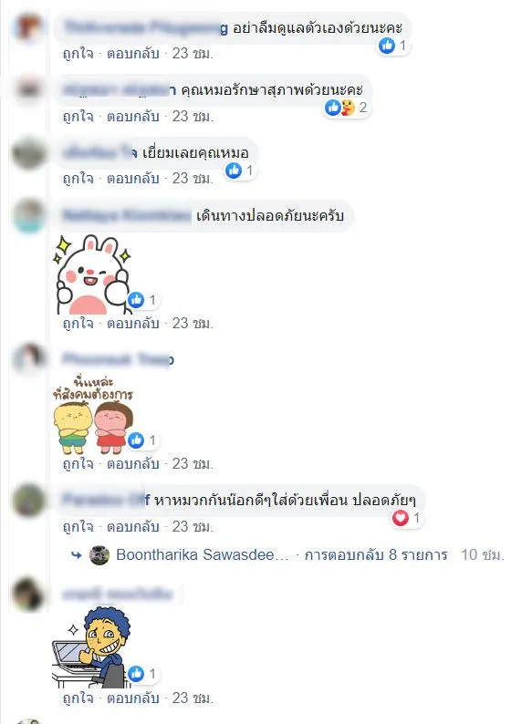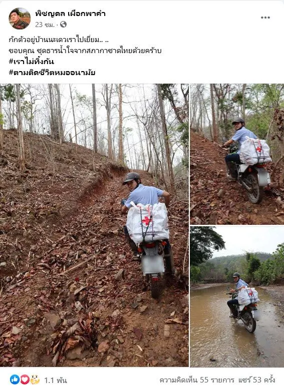 โดยผู้ใช้เฟซบุ๊กชื่อคุณพิชญดล เผือกพาคำ โพสต์ข้อความระบุว่า "กักตัวอยู่บ้านนะเดวเราไปเยี่ยม.. ..ขอบคุณ ชุดธารน้ำใจจากสภากาชาดไทยด้วยคร้าบ เราไม่ทิ้งกัน ตามติดชีวิตหมออนามัย"