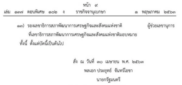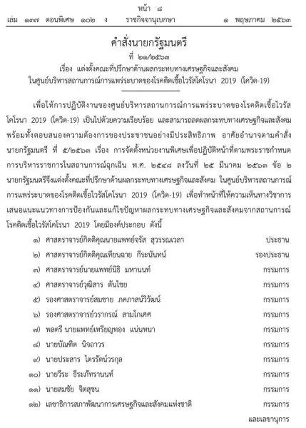 โดยเว็บไซต์ราชกิจจานุเบกษา เผยแพร่คำสั่งนายกรัฐมนตรี ที่ 21/2563 ลงนามโดย พล.อ.ประยุทธ์ จันทร์โอชา นายกรัฐมนตรี เรื่อง แต่งตั้งคณะที่ปรึกษาด้านผลกระทบทางเศรษฐกิจและสังคม ในศูนย์บริหารสถานการณ์การแพร่ระบาดของโรคติดต่อเชื้อไวรัสโคโรนา 2019 โดยระบุว่า