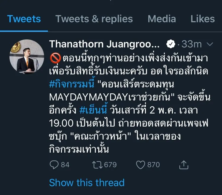 🚫ตอนนี้ทุกๆท่านอย่างเพิ่งส่งกันเข้ามาเพื่อรับสิทธิ์รับเงินนะครับ อดใจรอสักนิด #กิจกรรมนี้ "คอนเสิร์ตระดมทุน MAYDAYMAYDAYเราช่วยกัน" จะจัดขึ้นอีกครั้ง #เย็นนี้ วันเสาร์ที่ 2 พ.ค. เวลา 19.00 เป็นต้นไป ถ่ายทอดสดผ่านเพจเฟซบุ๊ก "คณะก้าวหน้า" ในเวลาของกิจกรรมเท่านั้น