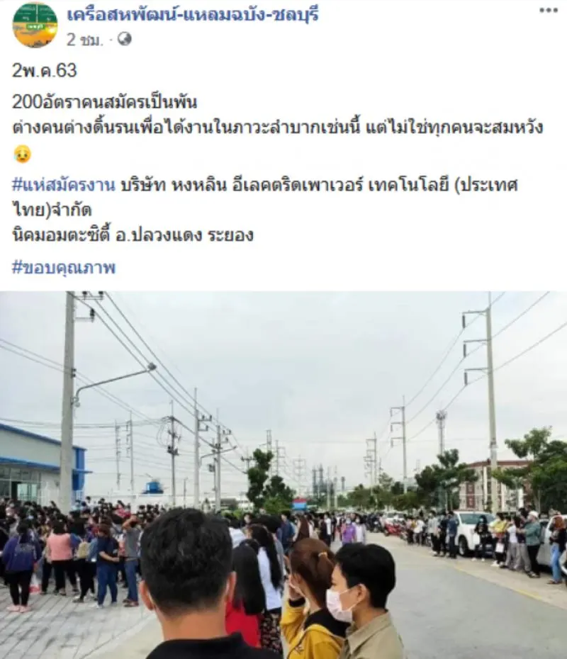 โดยทางเพจ เครือสหพัฒน์ แหลมฉบัง ชลบุรี ได้ระบุว่า 2 พ.ค.63 200 อัตราคนสมัครเป็นพัน ต่างคนต่างดิ้นรนเพื่อได้งานในภาวะลำบากเช่นนี้ แต่ไม่ใช่ทุกคนจะสมหวัง แห่สมัครงาน บริษัท หงหลิน อีเลคตริดเพาเวอร์ เทคโนโลยี ประเทศไทย จำกัด นิคมอมตะซิตี้ อำเภอปลวงแดง ระยอง