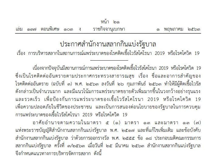 เมื่อวันที่ 2 พฤษภาคม เว็บไซต์ราชกิจจานุเบกษา เผยแพร่ประกาศ สำนักงานสลากกินแบ่งรัฐบาล เรื่อง การบริหารสลากในสถานการณ์แพร่ระบาดของโรคติดเชื้อไวรัส (ฉบับที่ 2)
