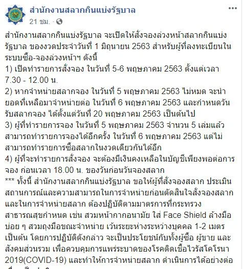 ขณะที่ เฟซบุ๊ก "สำนักงานสลากกินแบ่งรัฐบาล" โพสต์ข้อความระบุว่า สำนักงานสลากกินแบ่งรัฐบาล จะเปิดให้สั่งจองล่วงหน้าสลากกินแบ่งรัฐบาล ของงวดประจำวันที่ 1 มิถุนายน 2563 สำหรับผู้ที่ลงทะเบียนในระบบซื้อ-จองล่วงหน้าฯ ดังนี้