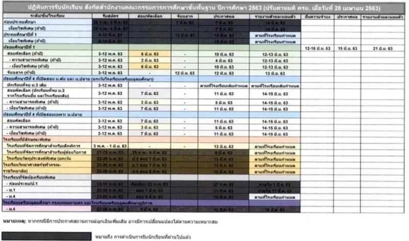 3.การประกาศผลสอบ ชั้นมัธยมศึกษาปีที่ 1 ในวันที่ 10 มิถุนายน 2563 และชั้นมัธยมศึกษาปีที่ 4 ในวันที่ 11 มิถุนายน 2563 4.การจัดหาสถานศึกษาและการรับรายงานตัว/มอบตัว ของนักเรียนทุกคน ชั้นมัธยมศึกษาปีที่ 1 ในวันที่ 12-13 มิถุนายน 2563 และชั้นมัธยมศึกษาปีที่ 4 ในวันที่ 14-15 มิถุนายน 2563