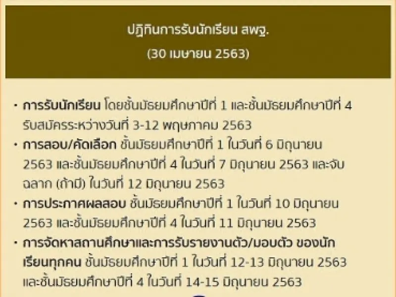สำหรับ ปฏิทินการรับนักเรียน สพฐ. มีรายละเอียดดังนี้ .การรับนักเรียน โดยชั้นมัธยมศึกษาปีที่ 1 และชั้นมัธยมศึกษาปีที่ 4 รับสมัครระหว่างวันที่ 3-12 พฤษภาคม 2563 2.การสอบ/คัดเลือก ชั้นมัธยมศึกษาปีที่ 1 ในวันที่ 6 มิถุนายน 2563 และชั้นมัธยมศึกษาปีที่ 4 ในวันที่ 7 มิถุนายน 2563 และจับฉลาก (ถ้ามี) ในวันที่ 12 มิถุนายน 2563