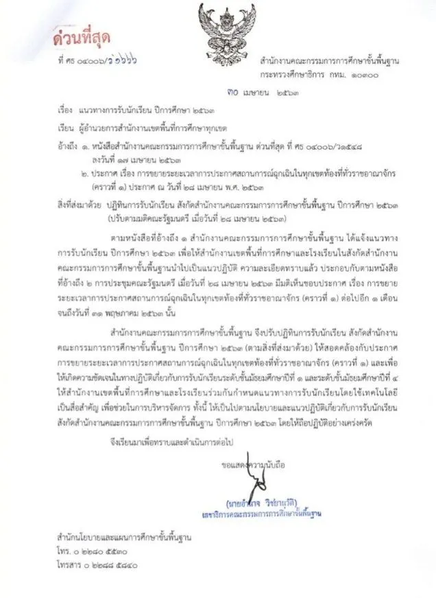 ด่วนที่สุด! สพฐ.ปรับปฏิทินรับนักเรียน ม.1 และ ม.4 ใหม่