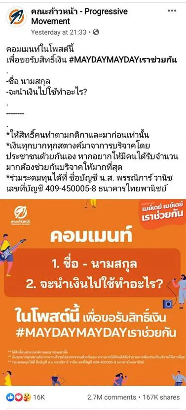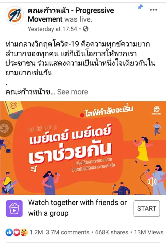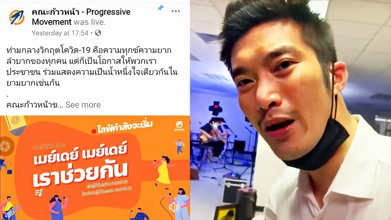 จากกรณีที่ “คณะก้าวหน้า” จัดกิจกรรมไลฟ์สด “คอนเสิร์ตระดมทุน #MAYDAYMAYDAY เราช่วยกัน” โดยให้ศิลปินอิสระซึ่งในช่วงนี้ไม่มีงานได้มาแสดงดนตรี พร้อมกับเปิดรับระดมทุน เพื่อจะส่งมอบต่อเงินช่วยดังกล่าวให้กับผู้ที่เดือดร้อนและขอรับสิทธิจำนวน 3,000 บาท ซึ่งกิจกรรมจัดในวันที่ 1 และ 2 พ.ค. ตั้งแต่เวลา 19.00 น. เป็นต้นไป
