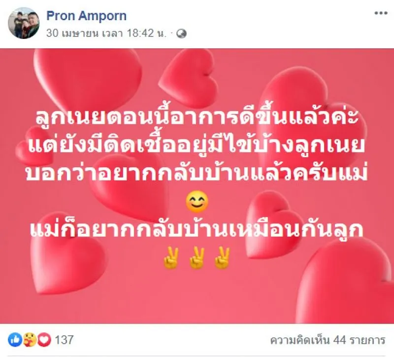 ล่าสุด คุณแม่ของน้องเนย ได้โพสต์อัพเดตอาการลูกชายให้ได้ฟังว่า ลูกเนยตอนนี้อาการดีขึ้นแล้วค่ะ มีไข้บ้างลูกเนยบอกว่าอยากกลับบ้านแล้วครับแม่ แม่ก็อยากกลับบ้านเหมือนกันลูก
