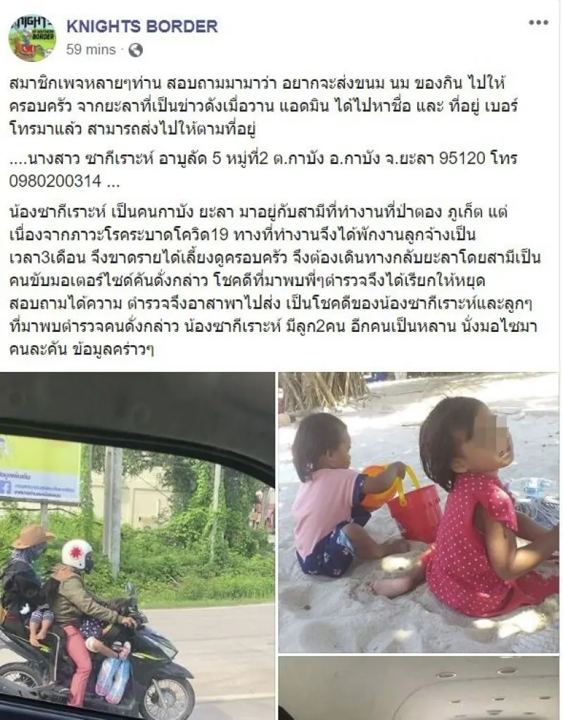 เจ้าหน้าที่ตำรวจจากสถานีตำรวจภูธรป่าตอง ภูเก็ต ได้ขับรถมาพบระหว่างทางที่จังหวัดกระบี่ สอบถามได้ความว่าเป็นพี่น้องชาวไทยมุสลิมจากยะลามาทำงานที่ภูเก็ต กำลังเดินทางกลับไปยะลาเนื่องจากภูเก็ตเปิดด่านให้ออกได้ ช่วงนี้ไม่มีงานทำเลยขนครอบครัวกลับบ้าน ที่ยะลา 5ชีวิตบนมอเตอไซด์1คัน