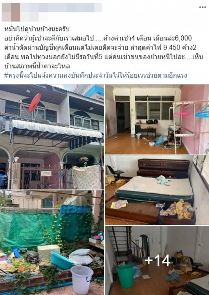 ผู้ใช้เฟซบุ๊กโพสต์ข้อความระบุว่า หมั่นไปดูบ้านบ้างนะครับ อย่าคิดว่าผู้เช่าจะดีกับเราเสมอไปค้างค่าเช่า 4 เดือน เดือนล่ะ 6,000 ค่าน้ำตัดผ่านบัญชีทุกเดือนแต่ไม่เคยคิดจะจ่าย ล่าสุดค่าไฟ 9,450 ค้าง2 เดือน พอไปทวงบอกยังไม่มีรอวันที่5 แต่คนเช่าขนของย้ายหนีไปล่ะ