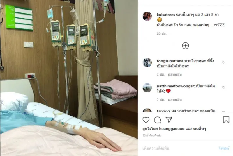 ล่าสุดสาว นิ้ง ได้ออกมาอัพเดทว่าเธอนั้นกำลังนอนรักษาตัวและรับยาอยู่ที่โรงพยาบาล พร้อมบอกว่า รอบนี้ เบาๆ แค่ 2 เสา 3 ยา ฝันดีนะคะ รัก รัก กอด กอดแน่นๆ หลังจากนั้นก็มีแฟนๆ และเพื่อนๆ ต่างเข้ามาส่งกำลังใจและส่งความคิดถึงให้เธอกันยกใหญ่