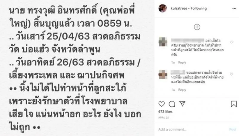 หลังช็อกสูญเสียคุณพ่อสามี แต่ นิ้ง กุลสตรี ไม่ได้ไปทำหน้าที่ลูกสะใภ้ เพราะตัวเองก็ยังรักษาตัวที่โรงพยาบาล ทำเจ้าตัวเสียใจ แน่นหน้าอก บอกไม่ถูก ท่ามกลางแฟนๆ เข้ามาให้กำลังใจจำนวนมาก