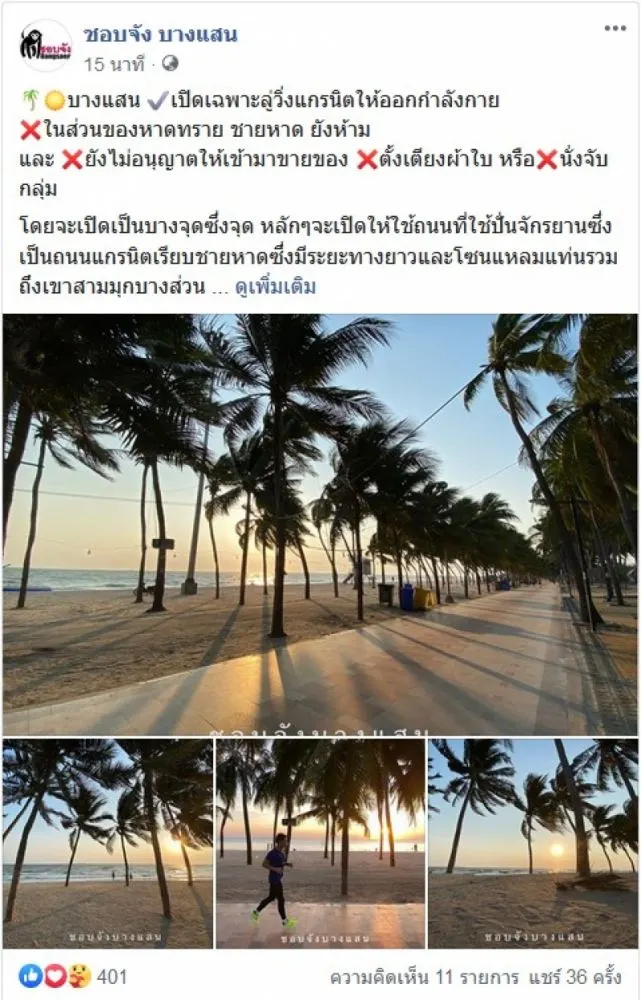 เมื่อวันที่ 4 พฤษภาคม เพจเฟซบุ๊ค ชอบจังบางแสน ได้โพสต์ภาพของชายหาดบางแสน ที่ได้เปิดให้ประชาชนได้มาออกกำลังกายแล้ว พร้อมระบุข้อความว่า บางแสน เปิดเฉพาะลู่วิ่งแกรนิตให้ออกกำลังกาย ในส่วนของหาดทราย ชายหาด ยังห้าม และ ยังไม่อนุญาตให้เข้ามาขายของ ตั้งเตียงผ้าใบ หรือ นั่งจับกลุ่ม โดยจะเปิดเป็นบางจุดซึ่งจุด หลักๆจะเปิดให้ใช้ถนนที่ใช้ปั่นจักรยานซึ่งเป็นถนนแกรนิตเรียบชายหาดซึ่งมีระยะทางยาวและโซนแหลมแท่นรวมถึงเขาสามมุกบางส่วน