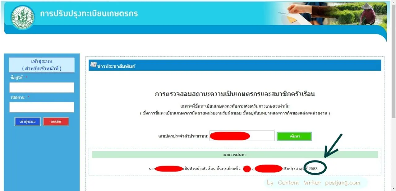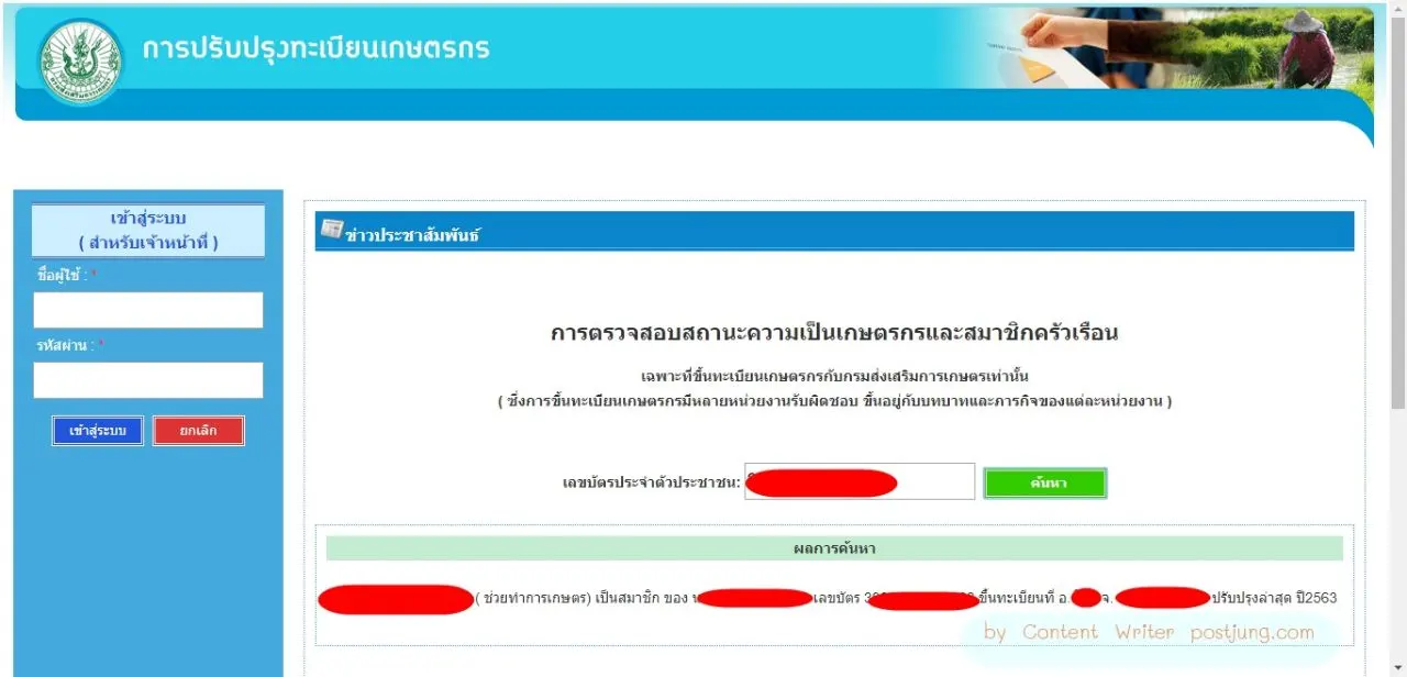 ระบบจะขึ้นว่า "(ชื่อ-สกุล)......... (ช่วยทำเกษตร) เป็นสมาชิกของ (ชื่อ-สกุล) ขึ้นทะเบียนที่ อ. xx จ. xxx ปรับปรุงล่าสุดปี 25xx"