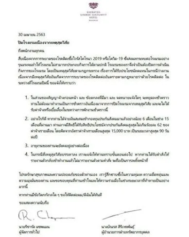 ผู้บริหาร โรงแรมเชอราตัน แกรนด์ สุขุมวิท โรงแรมหรูระดับ 5 ดาว ส่งจดหมายถึงพนักงานทุกคน แจ้งให้ทราบว่า จะปิดโรงแรม เนื่องจากเหตุสุดวิสัย จดหมายดังกล่าว ลงนามโดย นาริชาร์ด แชพแมน ผู้จัดการทั่วไป และ นางบัณรส สิริเวชพันธุ์ ผู้อำนวยการฝ่ายทรัพยากรบุคคล ระบุว่า สืบเนื่องจากcovid-19 ซึ่งส่งผลกระทบต่อโรงแรมอย่างรุนแรง จนทำให้โรงแรมไม่สามารถประกอบกิจการได้ตามปกติ