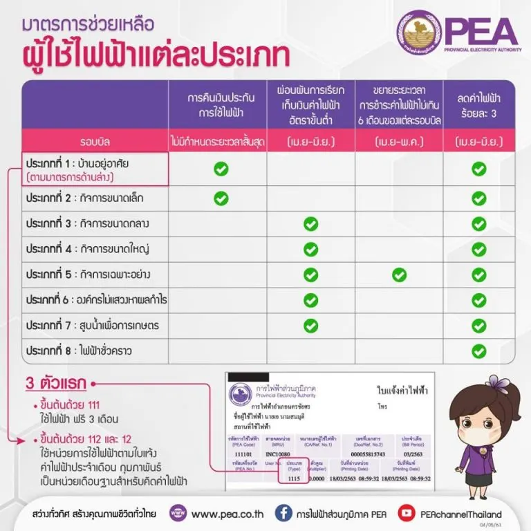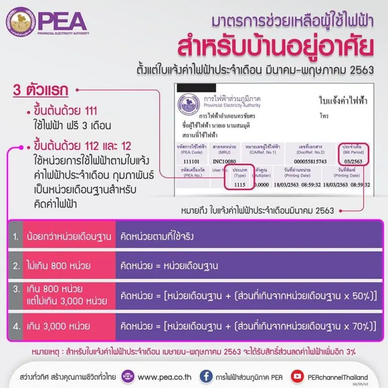 ในวันนี้ (5 พ.ค.63) ทางเพจ “การไฟฟ้าส่วนภูมิภาค PEA” ได้มีการโพสต์ มาตรการช่วยเหลือผู้ใช้ไฟฟ้าสำหรับบ้านอยู่อาศัย และมาตรการช่วยเหลือผู้ใช้ไฟฟ้าแต่ละประเภท ซึ่งหากดูเปรียบเทียบแล้ว ใบแจ้งค่าไฟฟ้า ประเภทที่ขึ้นต้น 111 ใช้ไฟฟรี 3 เดือน ส่วนขึ้นต้นด้วย 112 และ 12 ใช้หน่วยไฟฟ้าตามใบแจ้งค่าไฟฟ้าประจำเดือน กุมภาพันธ์ เป็นหน่วยเดือนฐานสำหรับคิดค่าไฟฟ้า