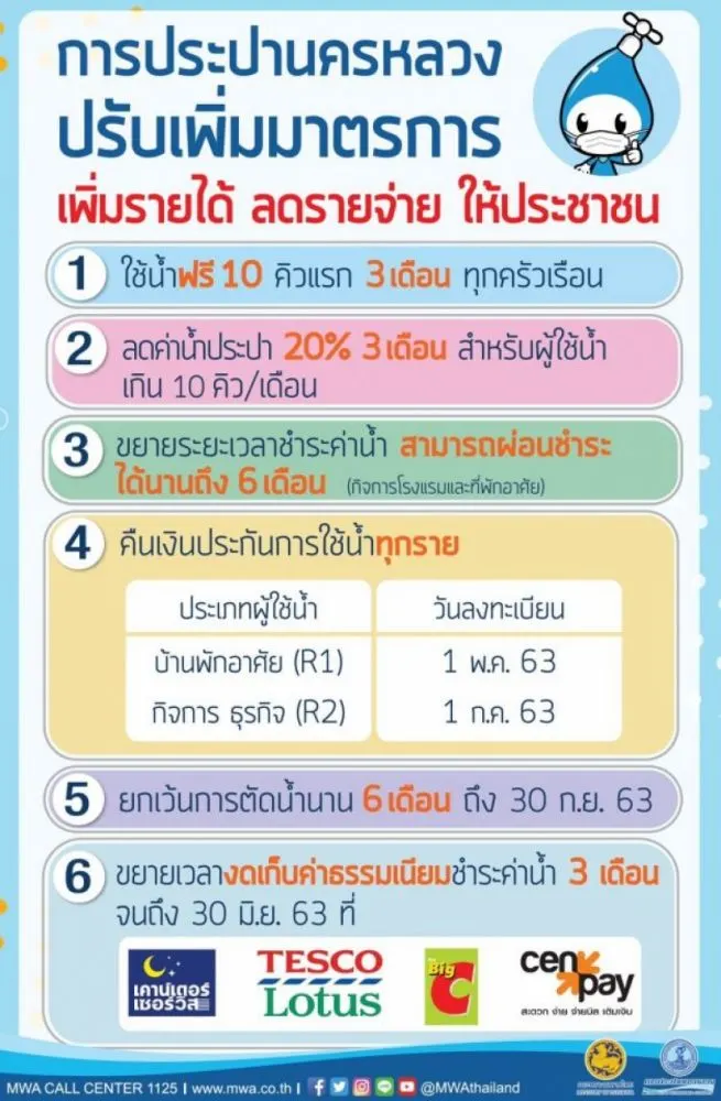 ทั้งนี้ คณะกรรมการ กปน. ได้มีมติเมื่อวันที่ 27 เมษายน 2563 และคณะรัฐมนตรีมีมติรับทราบ ในการประชุมคณะรัฐมนตรี ในวันนี้ (5 พฤษภาคม 2563) ได้เพิ่มเติมมาตรการช่วยเหลือประชาชน ดังนี้