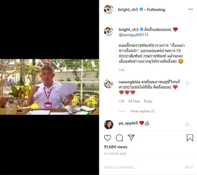 ล่าสุดเมื่อทางด้านอดีตพิธีกรคู่หูอย่าง สาวไบร์ท ได้ดูคลิปวิดีโอดังกล่าว ได้ออกมาโพสต์ข้อความถึงพี่ชายคนสนิทเอาไว้ว่า คิดถึงเสมอนะคะ ตอนนี้กรมราชทัณฑ์นำรายการ เรื่องเล่าชาวเรือนจำ ออกเผยแพร่ผ่านทาง FB ประชาสัมพันธ์ กรมราชทัณฑ์ แล้วนะคะ เผื่อแฟนข่าวอยากดูให้หายคิดถึงค่ะ