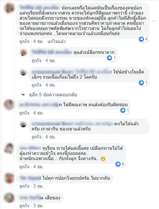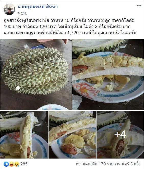 ล่าสุดผู้ใช้เฟซบุ๊กรายหนึ่งโพสต์ภาพพร้อมข้อความระบุว่า "ลูกสาวสั่งทุเรียนทางเฟส จำนวน 10 กิโลกรัม จำนวน 2 ลูก ราคากิโลล่ะ 160 บาท ค่าจัดส่ง 120 บาท ได้เนื้อทุเรียน ไม่ถึง 2 กิโลกรัมครับ ยากสอบถามท่านผู้รู้ว่าทุเรียนนี้ที่สั่งมา 1,720 บาทนี้ ได้คุณภาพหรือไหม่ครับ"