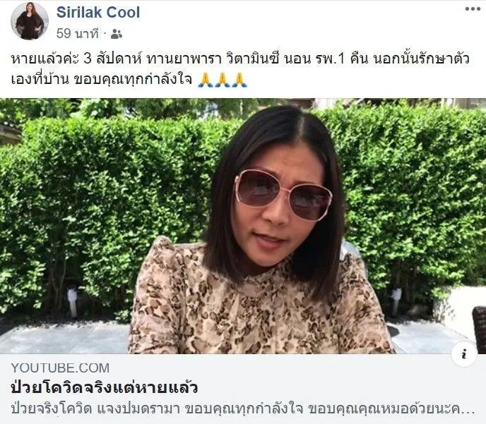 อย่างไรก็ตามสาวไทยรายนี้ยังบอกอีกว่า จะมาอัพเดทอาการให้ทราบเป็นระยะ และล่าสุดวันนี้(7พ.ค.63) เธอ ได้โพสต์ข้อความและภาพ พร้อมทั้งลิงค์คลิปวีดีโอจากยูทูบซึ่งเธอได้พูดคุยบอกกล่าวถึงอาการป่วยว่าหายจากโรคโควิด-19 แล้ว ซึ่งมีเนื้อหาบางส่วนว่า