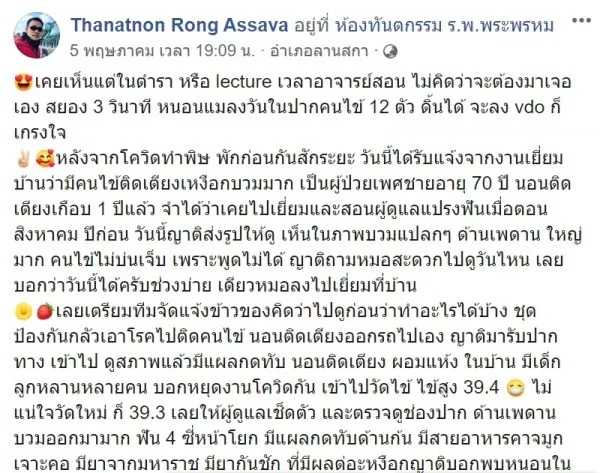 เลยเตรียมทีมจัดแจ้งข้าวของคิดว่าไปดูก่อนว่าทำอะไรได้บ้าง ชุดป้องกันกลัวเอาโรคไปติดคนไข้ นอนติดเตียงออกรถไปเอง ญาติมารับปากทาง เข้าไปดูสภาพแล้วมีแผลกดทับ นอนติดเตียง ผอมแห้ง ในบ้าน มีเด็ก ลูกหลานหลายคน บอกหยุดงานโควิดกัน เข้าไปวัดไข้ ไข้สูง 39.4 ไม่แน่ใจวัดใหม่ ก็ 39.3 เลยให้ผู้ดูแลเช็ดตัว และตรวจดูช่องปาก ด้านเพดานบวมออกมามาก ฟัน 4 ซี่หน้าโยก มีแผลกดทับด้านก้น มีสายอาหารคาจมูก เจาะคอ มียาจากมหาราช มียากันชัก ที่มีผลต่อเหงือก