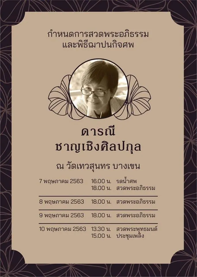 สวดอภิธรรม วันที่ 7-9 พฤษภาคม 2563 เวลา 18.00 น. ฌาปนกิจ วันอาทิตย์ที่ 10 พฤษภาคม เวลา 15.00 น.