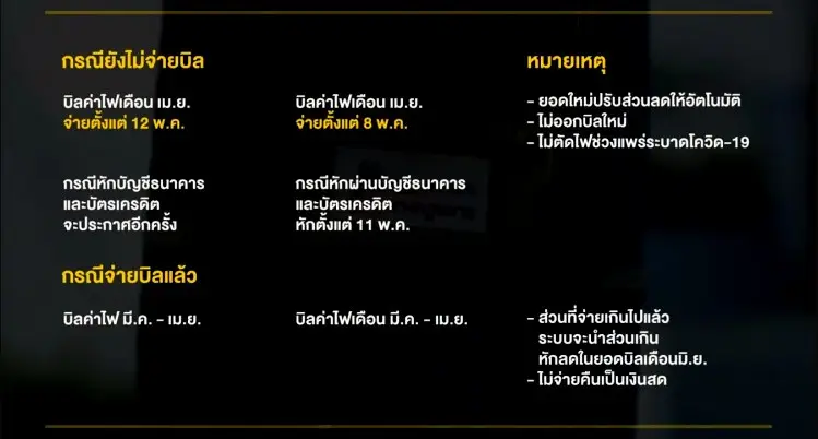 การไฟฟ้าส่วนภูมิภาค แนะนำว่าให้รอจ่ายบิล ตั้งแต่วันที่ 8 พ.ค. เป็นต้นไป โดยเมื่อนำบิล (ไม่มีการออกบิลใหม่) ไปจ่ายทุกช่องทาง ระบบจะปรับปรุงยอดอัตโนมัติโดยมีส่วนลดให้แล้ว ส่วนกรณีผู้ที่จ่ายผ่านการหักจากบัญชีธนาคารและบัตรเครดิต จะหักตั้งแต่วันที่ 11 พ.ค. เป็นต้นไป