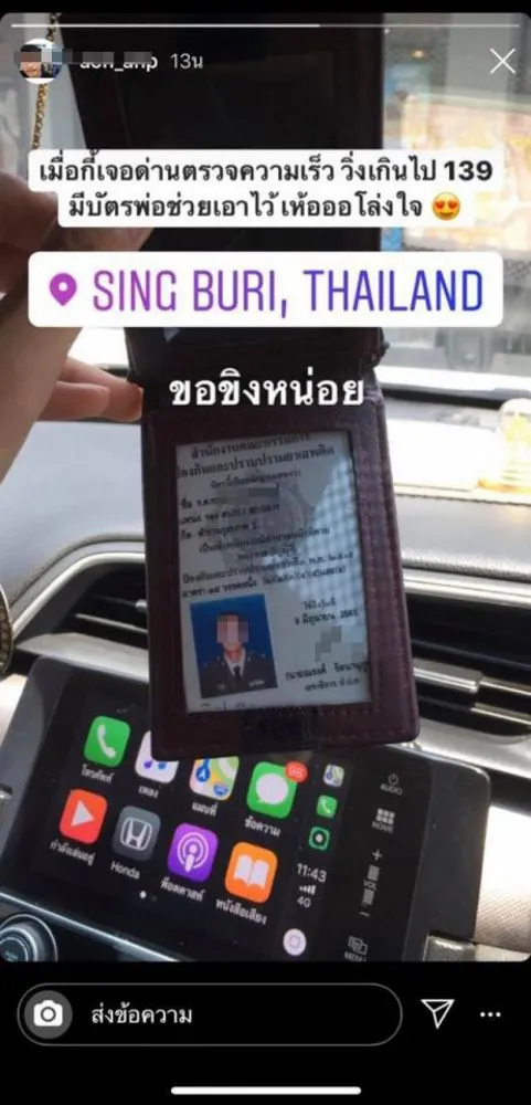 โดยเพจ Red Skull Variety นำภาพสตอรี่เฟซบุ๊กของหนุ่มรายหนึ่งมาเผยแพร่ โดยในภาพหนุ่มรายนี้ระบุว่าตนได้ขับรถด้วยความเร็วเกินกำหนด และดันไปเจอด่านตรวจความเร็ว แต่ดีที่มีบัตรตำรวจของพ่อยก ร.ต.ท. ติดรถไว้ทำให้ไม่โดนดำเนินคดี เมื่อกี้เจอด่านตรวจความเร็ว วิ่งเกินไป 139 มีบัตรพ่อช่วยเอาไว้ เห้อ โล่งใจ ขอขิงหน่อย