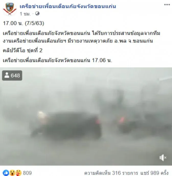 เมื่อเวลาประมาณ 17.00 น. ในโลกออนไลน์มีการส่งต่อคลิปเหตุการณ์ฝนถล่มหนักในหลายจังหวัดภาคตะวันออกเฉียงเหนือ โดยเฉพาะในอำเภอพล จังหวัดขอนแก่น มีลมพายุพัดกระหน่ำอย่างรุนแรง โดยเพจเฟสบุ๊ค เครือข่ายเพื่อนเตือนภัยขอนแก่น ได้ระบุข้อความว่า