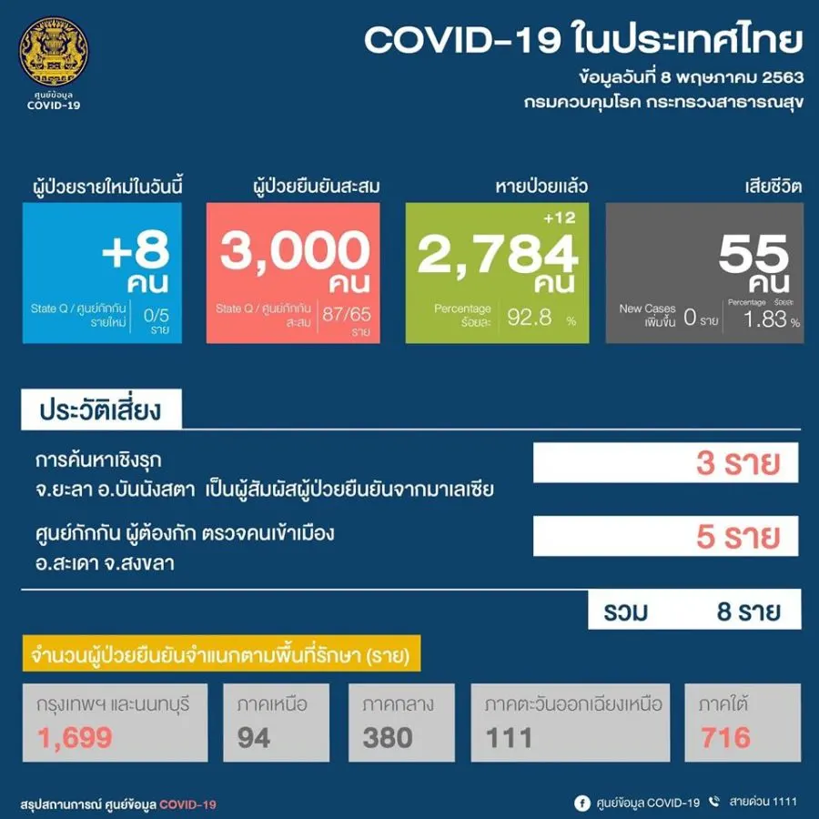 8 พ.ค. 2563 อัพเดทผู้ติดเชื้อโควิด-19 สะสมในประเทศไทย จาก ศูนย์บริหารสถานการณ์โควิด-19 (ศบค.) และ Worldometers มีรายละเอียดดังนี้