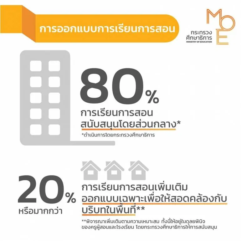 - กระทรวงศึกษาธิการ จะเป็นผู้สนับสนุนการเรียนการสอนทางไกลในสัดส่วน ร้อยละ 80 เพื่อให้ทุกคนสามารถเข้าถึงการเรียนขั้นพื้นฐานได้ ส่วนอีกร้อยละ 20 หรือมากกว่า ให้ทางโรงเรียนและครูในแต่ละพื้นที่พิจารณาออกแบบตามความเหมาะสม