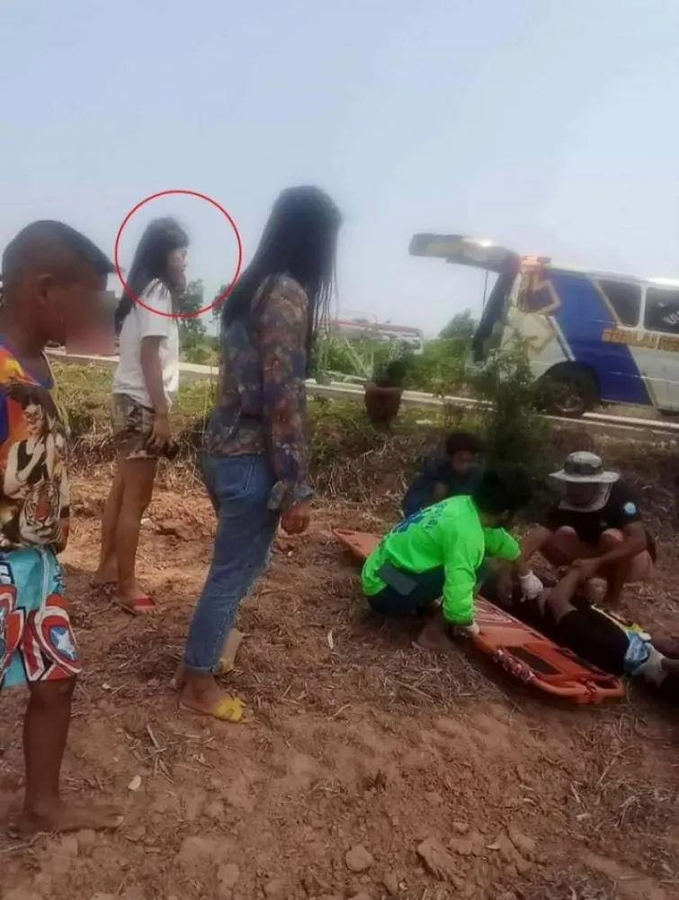 แต่ในขณะเจ้าหน้าที่กำลังช่วยเหลือผู้ได้รับบาดเจ็บอยู่นั้น ผู้บาดเจ็บได้เกิดอาการร้องเอะอะโวยวายเสียงดังคล้ายกับเห็นสิ่งลึกลับจนกระทั่งนำตัวไปส่งถึงโรงพยาบาล และเมื่อเจ้าหน้าที่กู้ภัยส่งผู้บาดเจ็บที่โรงพยาบาลเสร็จเรียบร้อยแล้ว เจ้าหน้าที่ได้ตรวจสอบภาพถ่ายบริเวณสถานที่เกิดเหตุก็พบภาพใบหน้าของชายปริศนา มีลักษณะสีดำคล้ำโผล่ออกมาจากด้านข้างของหลานสาวผู้บาดเจ็บที่มายืนดูที่เกิดเหตุ ซึ่งจากการสอบถามผู้ที่อยู่ในเหตุการณ์ทุกคนก็บอกว่าไม่มีใครเห็นชายลักษณะดังกล่าวยืนอยู่ในที่เกิดเหตุแต่อย่างใด