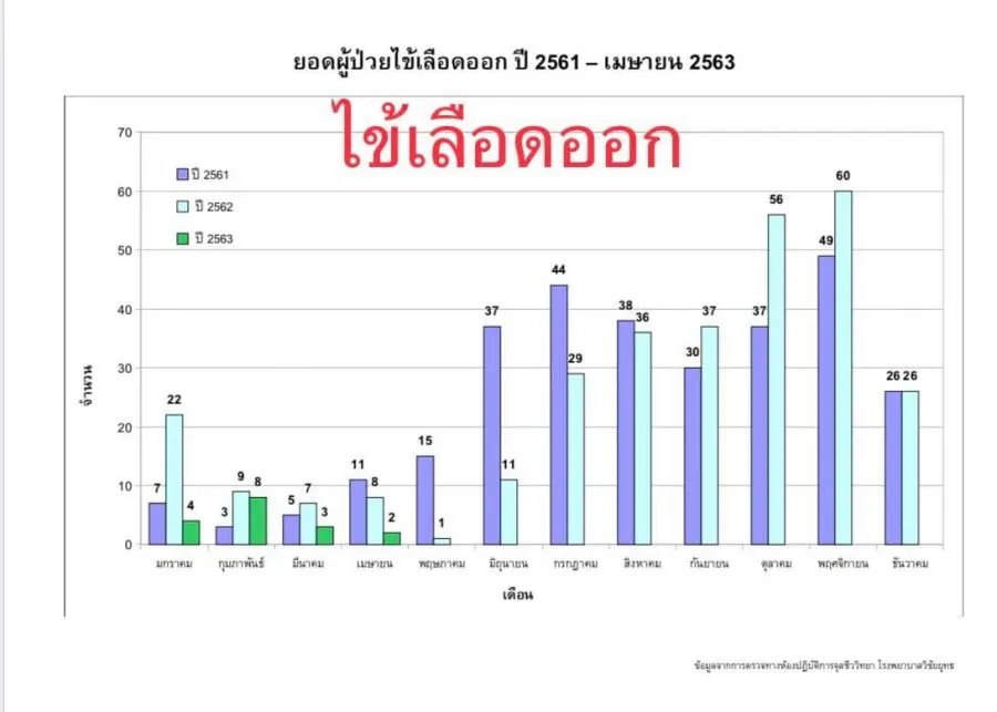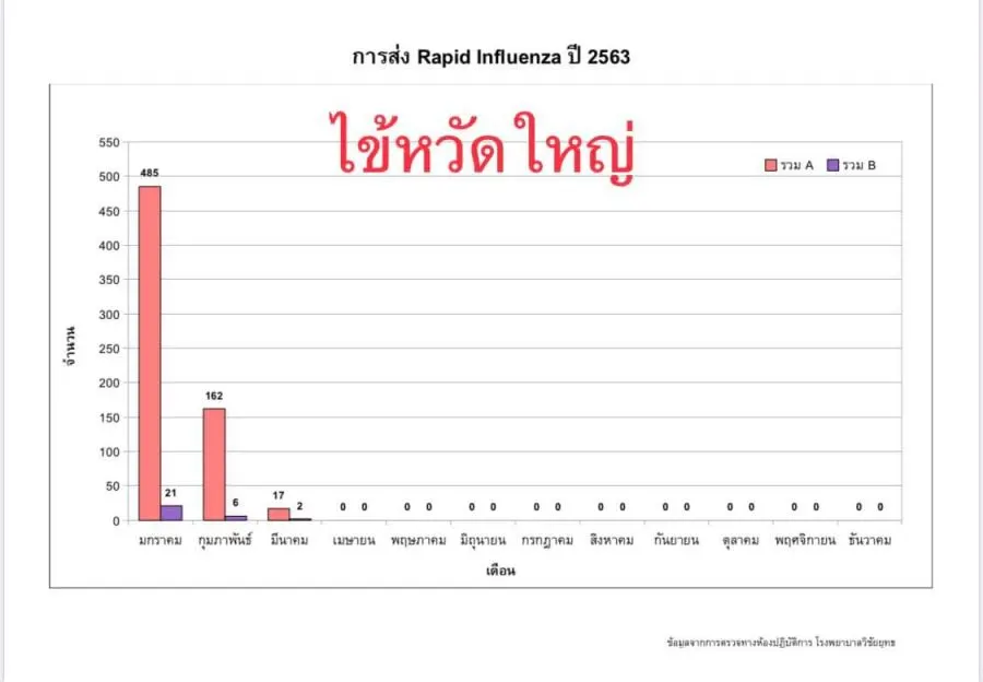 ทั้งนี้ ข้อมูลของโรงพยาบาลวิชัยยุทธพบ พบว่า โรคไข้หวัดใหญ่ เช่น สายพันธุ์เอ เมื่อเดือนมกราคม มีคนเป็นกว่า 485 คน และสายพันธุ์บี มีคนเป็นกว่า 21 คน แล้วก็ลดลงมาเรื่อย ๆ จนกระทั่งเดือนสิงหาคม ที่ไม่มีนเป็นไข้หวัดใหญ่สายพันธุ์เอหรือบีเลย
