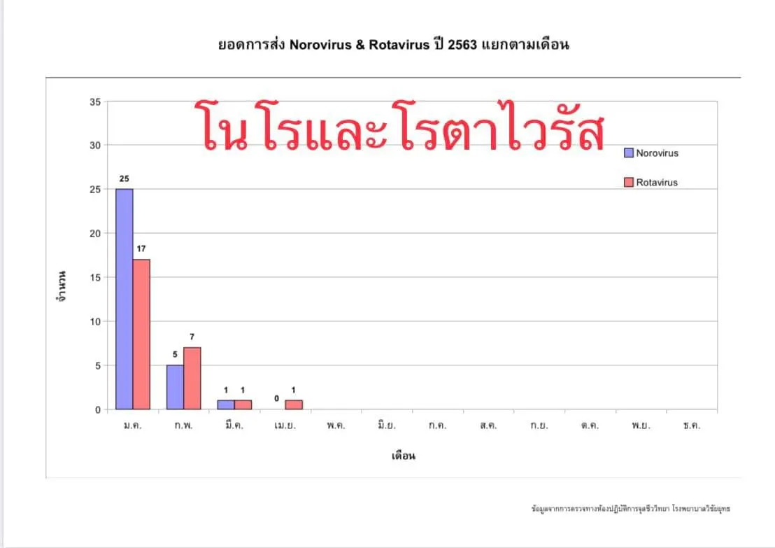 ในส่วนของ โรคไวรัส Noro (โนโร) และ Rota(โรตา) ทำให้เกิดอาการท้องร่วงอย่างรุนแรงทั้งในเด็กและผู้ใหญ่ ไวรัสโนโรไม่พบเลย และไวรัสโรตาพบเพียง 1 คนเท่านั้น
