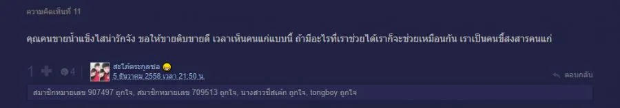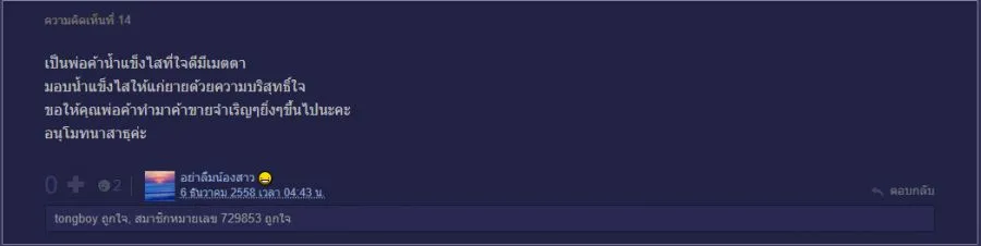 “เป็นพ่อค้าน้ำแข็งใสที่ใจดีมีเมตตา มอบน้ำแข็งไสให้แก่ยายด้วยความบริสุทธิ์ใจ ขอให้คุณพ่อค้าทำมาค้าขายจำเริญๆ ยิ่งๆ ขึ้นไปนะคะอนุโมทนาสาธุค่ะ”
