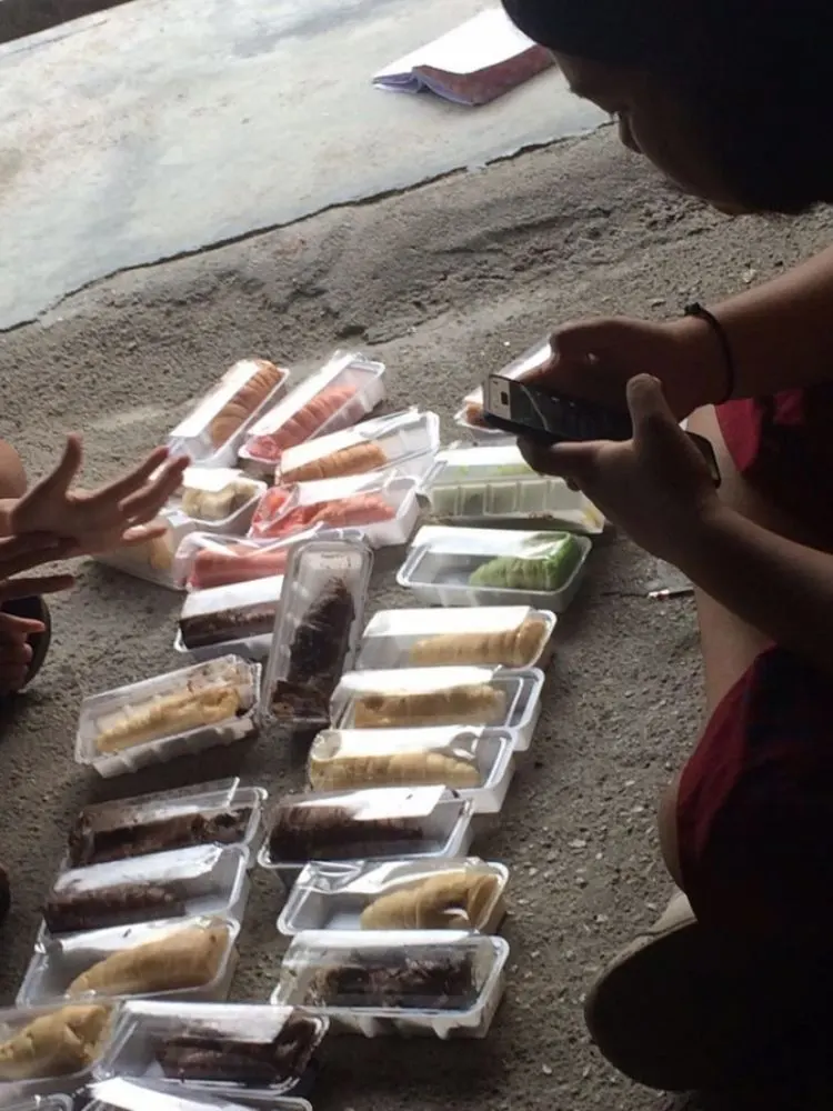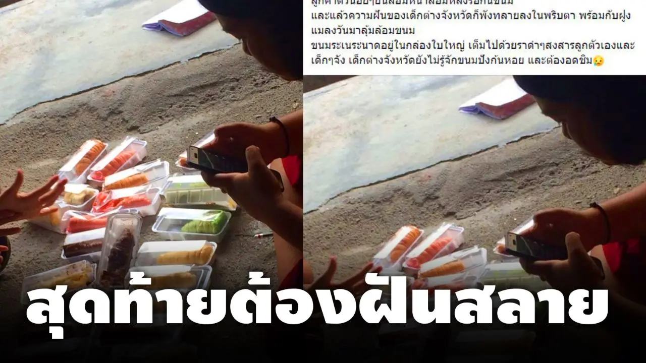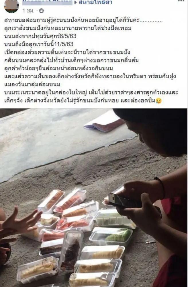 ลูกค้าตัวน้อยๆยืนล้อมหน้าล้อมหลังรอกินขนมและแล้วความฝันของเด็ กต่างจังหวัดก็พังทลายลงในพริบตา พร้อมกับฝูงแมลงวันมาลุ้มล้อมขนม ขนมระเนระนาดอยู่ในกล่องใบใหญ่ เต็มไปด้วยราดำๆสงสารลูกตัวเองและเด็กๆจัง เด็กต่างจังหวัดยังไม่รู้จักขนมปังก้นหอย และต้องอดชิม