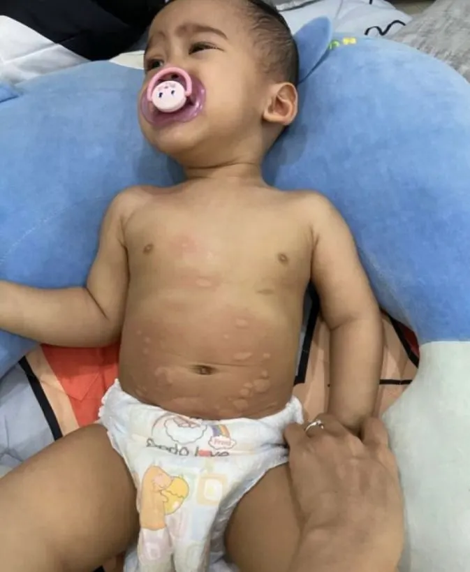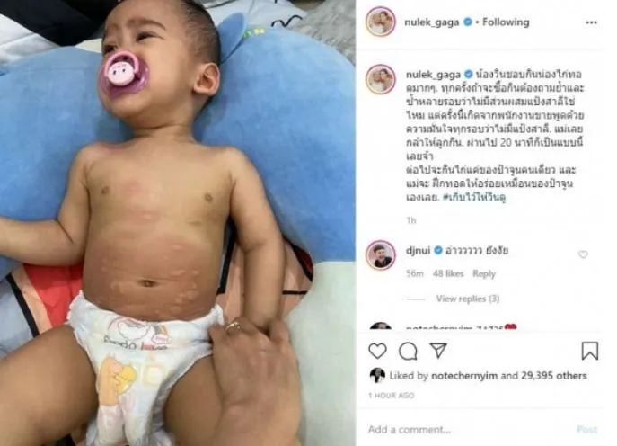 ซึ่งพนักงานก็ยืนยันอย่างชัดเจนว่าไม่มี แต่พอลูกชายกินได้ไม่นาน ก็มีผื่นแดงขึ้นเต็มตัว งานนี้ทำคุณถึงกับหัวร้อน โดยได้โพสต์ภาพลูกชายที่มีผื่นเต็มตัว พร้อมทั้งระบุข้อความว่า