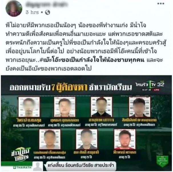 ทั้งนี้ เมื่อเรื่องราวดังกล่าวนั้นแดงขึ้นมา และมีการลงโทษเบื้องต้น สำหรับชาย 7คนดังกล่าว กลับมีรุ่นพี่ครูที่โรงเรียน ได้ออกมาแสดงความคิดเห็น เชิงให้กำลังใจกับกลุ่มคนดังกล่าวอย่างน่าแปลกใจ แถมยังมีการโพสต์ให้กำลังใจ ลงในโลกออนไลน์ ว่าไม่อาย ที่มีพวกเค้าเหล่านี้เป็นน้อง ให้กำลังใจ หวังว่าจะกลับมามีชีวิตในสังคมได้ ซึ่งก็สร้างความสับสนในกมลสันดาน ของหลากหลายผู้คนที่ได้รับรู้เป็นอย่างยิ่ง