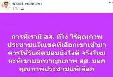 12 พ.ค.63-ดร.เสรี วงษ์มณฑา ผู้ร่วมก่อตั้งสถาบันทิศทางไทย นักวิชาการด้านสื่อสารมวลชนและการตลาด โพสต์ข้อความผ่านเฟซบุ๊กว่าการที่เรามี ส.ส. ที่โง่ ไร้คุณภาพ ประชาชนในเขตที่เลือกเขาเข้ามาควรให้รับผิดชอบยังไงดี จริงไหมคะที่เขาบอกว่าคุณภาพ ส.ส. บอกคุณภาพประชาชนที่เลือก.